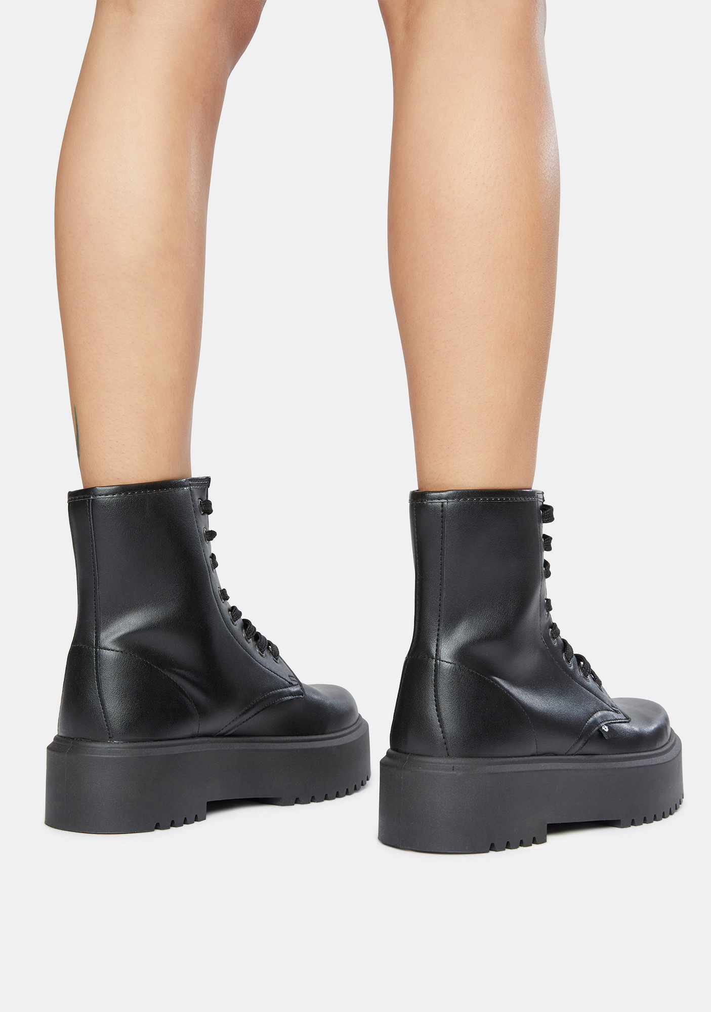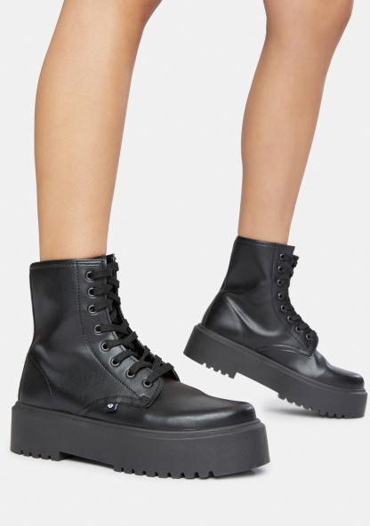 Katie Comfy Platform Boots cuz you’re better at bein’ bad. These vegan leather combat boots have chunky platform soles, rounded toes, and lace up fronts.