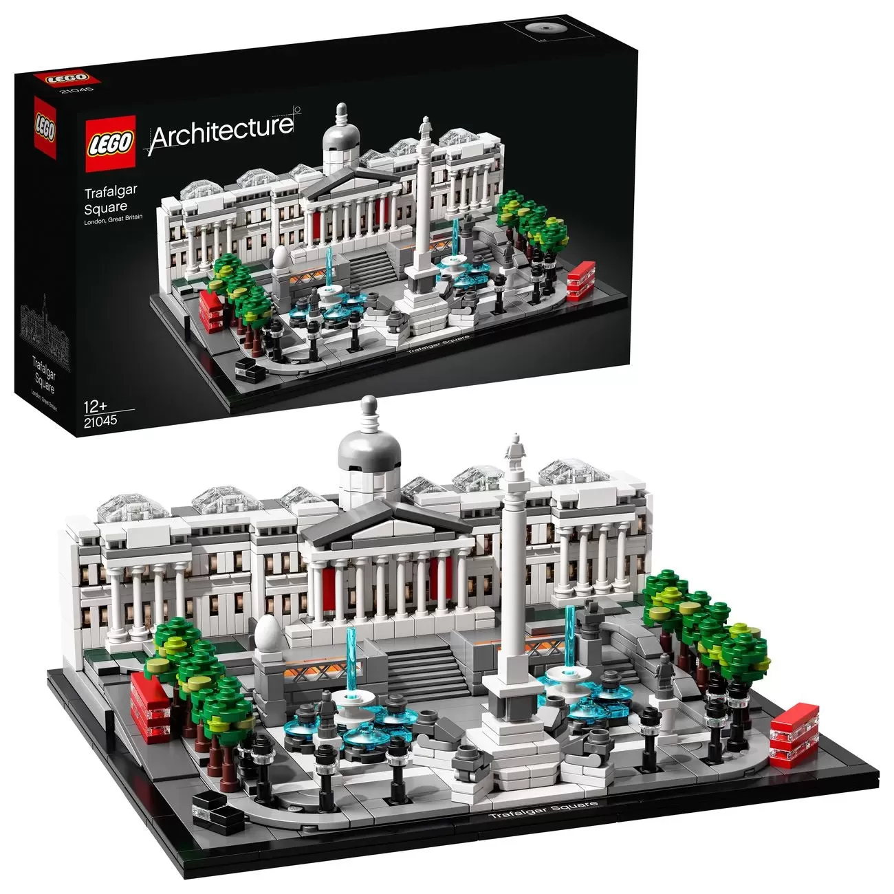 Capture the essence of a historical London landmark with the LEGO© Architecture 21045 Trafalgar Square set. Named in honor of Lord Horatio Nelson following his 1805 naval victory over Napoleon, the square has since become a popular tourist attraction and preferred location for political and community gatherings. This detailed LEGO interpretation depicts the domed National Gallery complete with columned facade, Nelson's Column flanked by 4 lions, the square's famous fountains and 4 sculpture plinths. The sections at the rear of the National Gallery structure can be removed for access to a detailed interior with brick-built statue and paintings. Tree-lined borders, ornate lampposts, 2 London buses, 2 black cabs and a tiled baseplate depicting the square and surrounding roads complete the model. Finished with a decorative nameplate, this collectible building set delivers a highly satisfying building experience to all with an interest in architecture, travel, history and design, and makes a truly iconic centerpiece for the home or office.