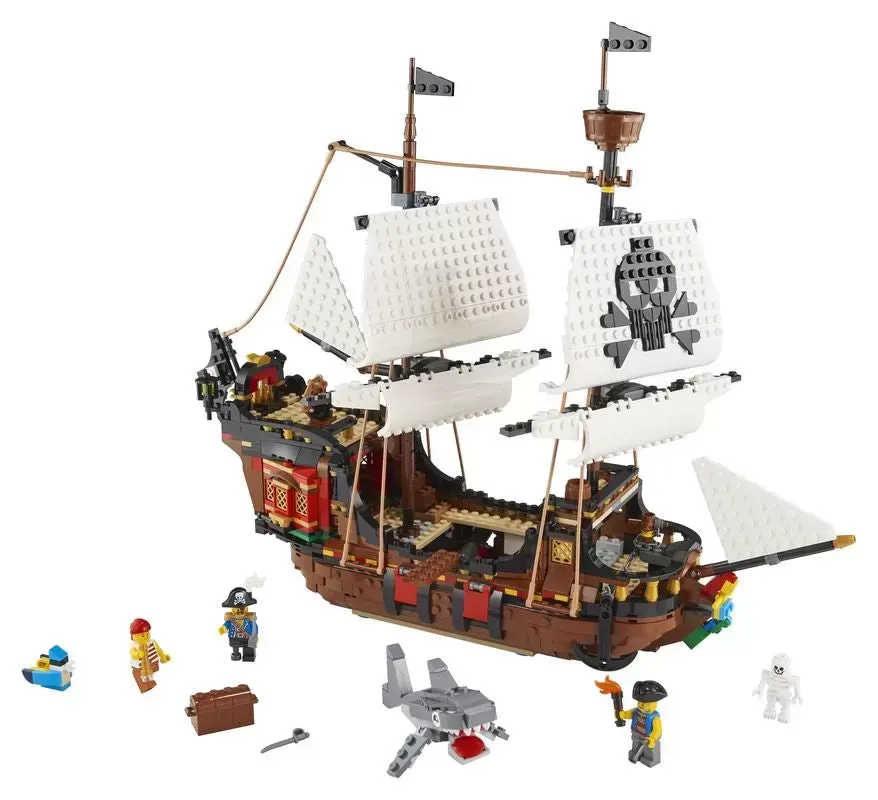 LEGO Creator 3in1's Pirate Ship (31109) set encourages kids' creative play, featuring 3 models in 1: A classic Pirate Ship, rustic Pirates' Inn and mysterious Skull Island. Building and rebuilding keeps the play going.