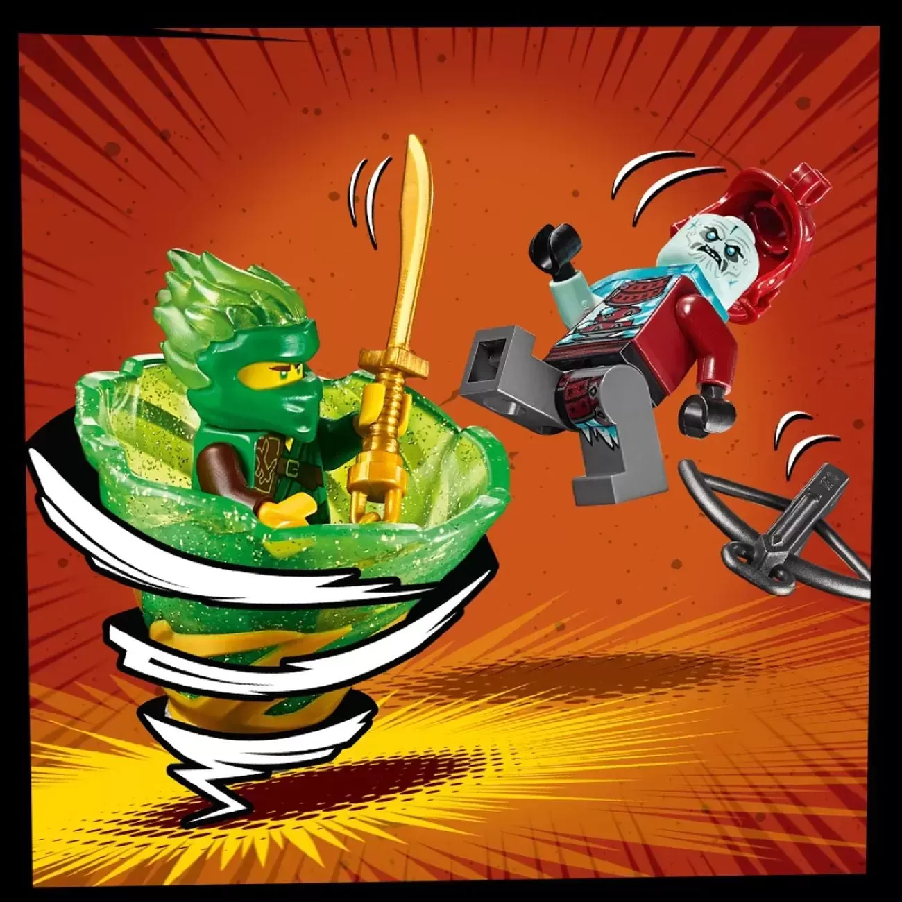 • Weapons include Cole's silver-colored katana and gold-colored hammer, Akita's dagger, the Ice Emperor's Scroll of Forbidden Spinjitzu weapon, General Vex's ice spear, Blizzard Sword Master's 2 ice katanas and Blizzard Archer's crossbow.