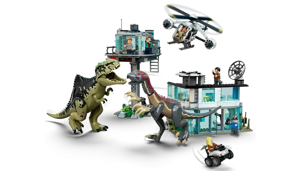 6 minifigures – Owen Grady, Claire Dearing, Dr. Alan Grant, Dr. Ellie Sattler, Kayla Watts and Dr. Henry Wu, plus a posable Giganotosaurus measuring over 12.5 in. (32cm) long, and a Therizinosaurus