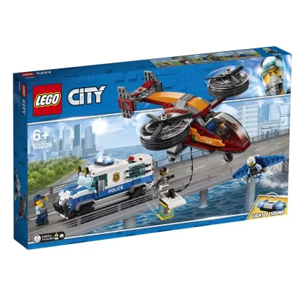 Patrol the LEGO© City streets from the sky with the awesome 60209 Sky Police Diamond Heist set, featuring an armored police transporter truck with opening roof, new-for-January-2019 working light and sound brick, jail cell and removable gem safe. This action-packed LEGO City police set also includes a police winged jetpack, a crook's helicopter with spinning rotors, plastic climbing rope and opening cockpit, plus 4 minifigures.