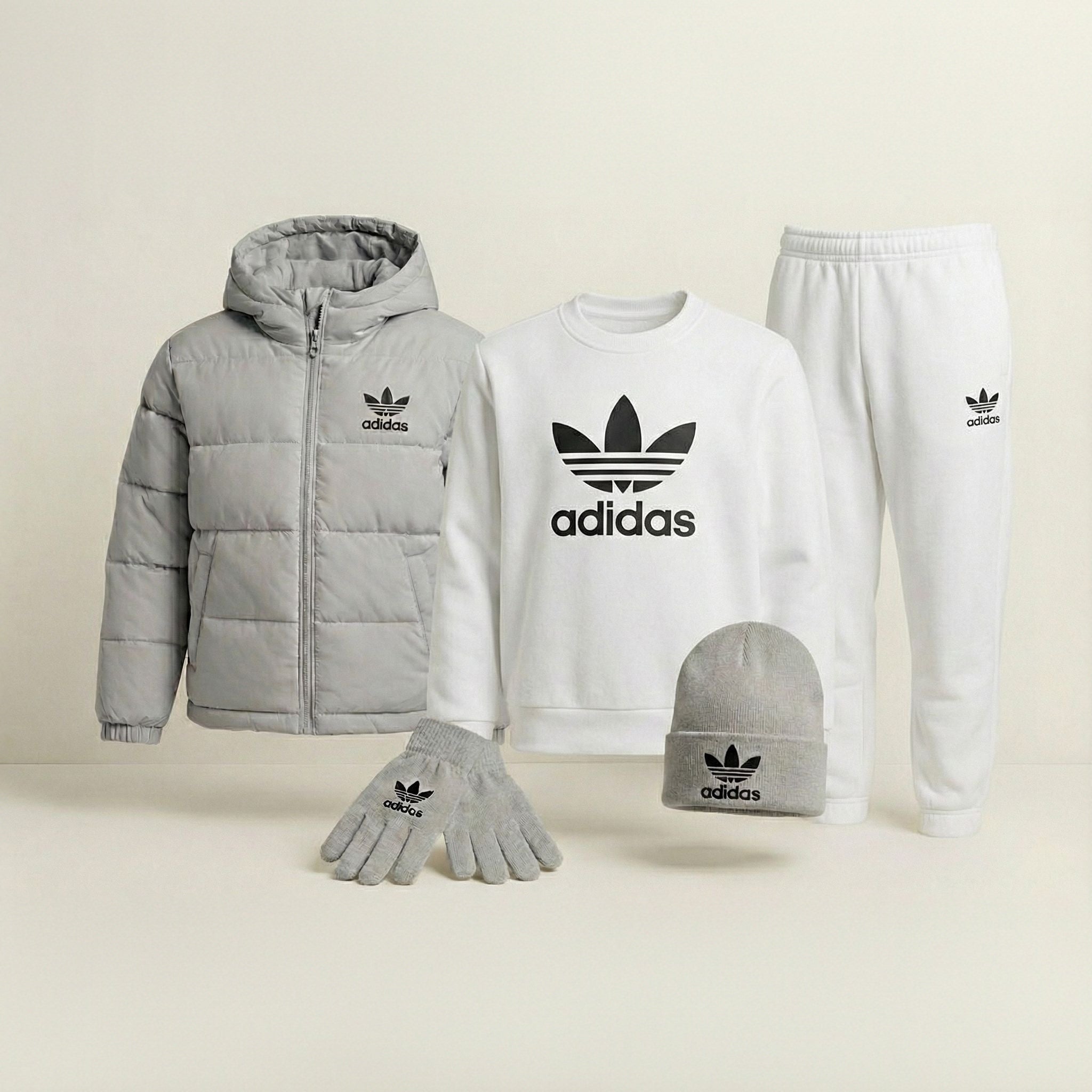 Affrontez la saison avec le Kit Grand Froid, un ensemble complet de cinq pièces qui fusionne protection thermique et design urbain. L'alliance de la veste matelassée isolante et du duo sweat-pantalon en molleton offre un confort "cocooning" immédiat, tandis que le bonnet et les gants assurent une barrière totale contre les éléments. Une harmonie parfaite pour un look maîtrisé sans effort.