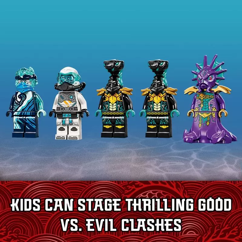 The dragon toy comes with 5 minifigures: NRG Nya, Scuba Zane with flippers, Prince Kalmaar and 2 dangerous Maaray Guards for kids to act out exciting clashes to winthe prized wave amulet. There is also a mini submarine with a cockpit for Scuba Zane to ride in, and a display stand for the amulet.