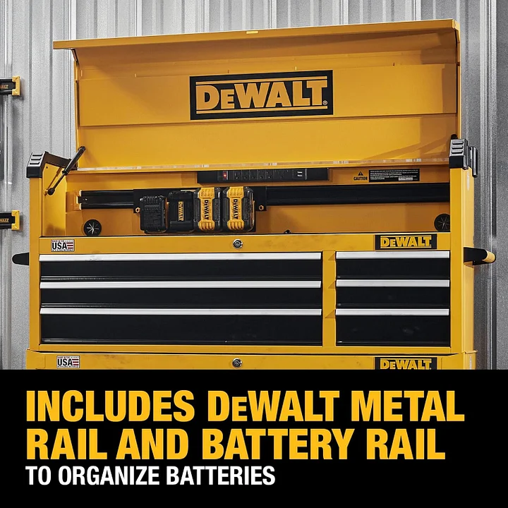 - Chest comes with the DEWALT Metal Rail mounted inside the chest and a Battery Rail that organizes up to four DEWALT batteries (DEWALT 12V MAX, DEWALT 20V MAX, or DEWALT FLEXVOLT batteries)